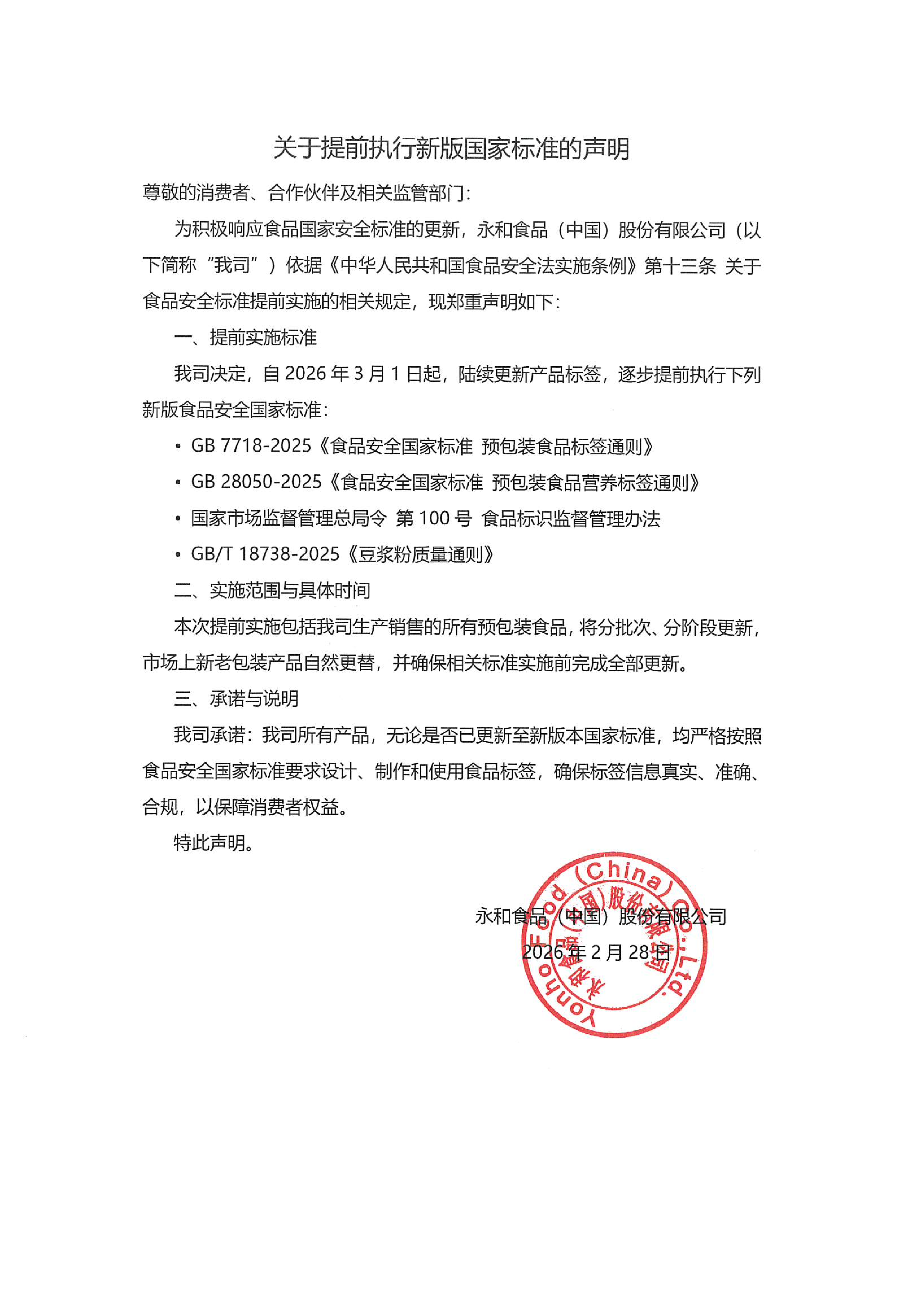 永和食品(中國(guó))股份有限公司關(guān)于提前執(zhí)行新版國(guó)家標(biāo)準(zhǔn)的聲明